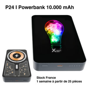SCX Design is innovating with its new P24 power bank, which features a colorful illuminated logo. This 10,000 mAh power bank, as well as the 5,000 mAh P23 model, benefits from exclusive digital printing done in France. This technology allows for the personalization of power banks with a colorful, illuminated logo, giving charging accessories a modern and distinctive touch.