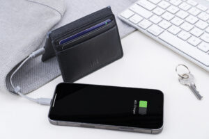 The XOOPAR Wallet is a premium card holder made from recycled leatherette, combining elegance and functionality. This compact wallet features four RFID-blocking slots to protect personal data and a built-in 3000 mAh power bank, compatible with various devices. With its understated design and practical features, it represents a refined and modern choice for holiday gifts.
