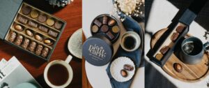 Square or round bell-shaped boxes, magnetic flap boxes – the boxes in which we package these chocolate candies are made entirely of cardboard, without plastic, to minimize our environmental impact. Matte black in color, they can be personalized with hot foil stamping in gold, silver, or copper.