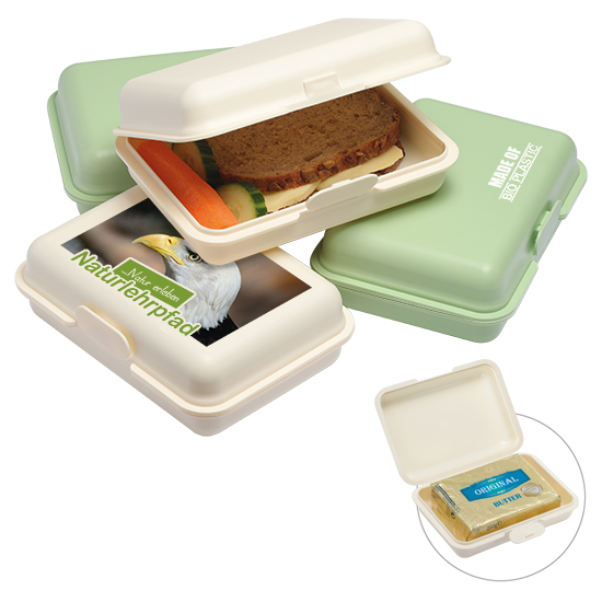 Pratique et polyvalente, cette boîte à casse-croûte (réf. 7262BIO) du fabricant Hepla est disponible en deux couleurs standard (vert clair et beige) et offre une zone de marquage particulièrement grande, pour une personnalisation par sérigraphie ou impression numérique.