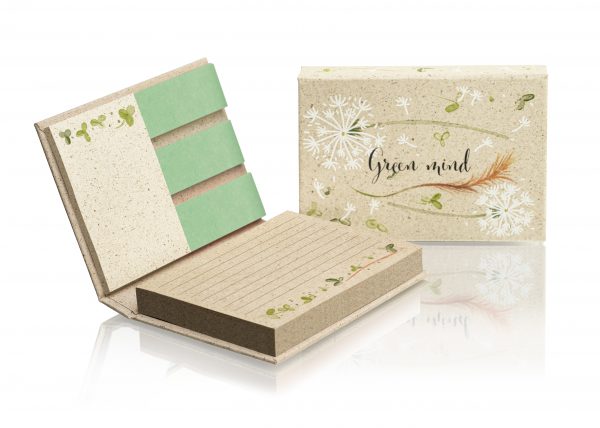 Le bloc-notes adhésif (réf. PM100 Grass) de Promonotes dispose d’une couverture rigide en papier recyclé à base d’herbe (teneur en fibres d’herbe jusqu’à 30 %). Les notes repositionnables sont également fabriquées à partir de papier herbe, tandis que les onglets sont en papier recyclé.
