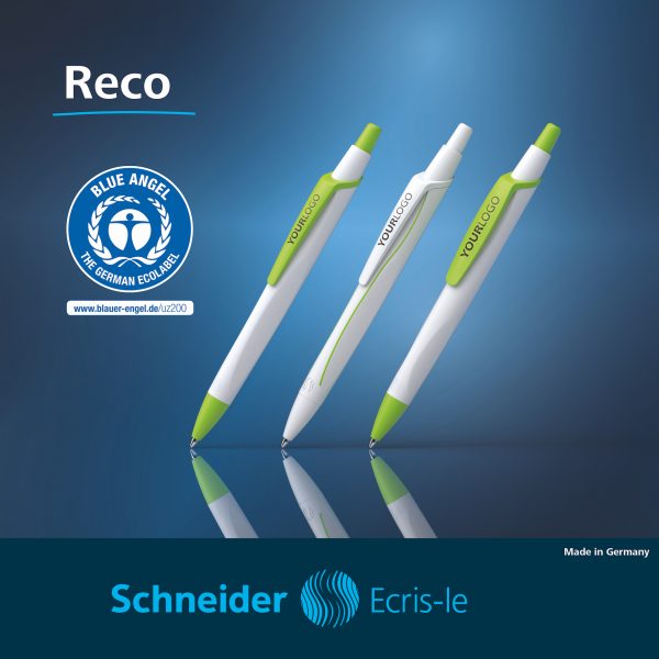 Le modèle « Reco » du fabricant Schneider est devenu le premier stylo à bille certifié par le très exigeant label allemand L’Angle Bleu ? Stylo rechargeable, dont le corps est composé à 92 % de plastique recyclé, le Reco offre un design épuré, associé à une surface mate satinée qui lui confère un look élégant. Nouveau : Disponible en trois versions, il est équipé de la recharge Eco 725 M en plastique recyclé, dont l’encre, développée en interne, répond aux exigences du label. Et le marquage en tampographie peut être proposé avec mention du label.