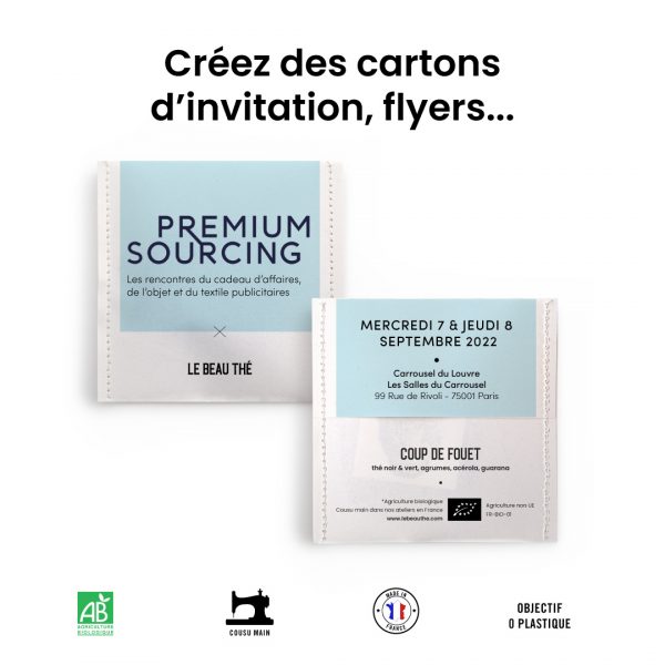 Récemment, un nouveau format inédit a été développé : la carte à infuser. Composé d’une carte que vous pouvez personnaliser avec votre design et d’un sachet de thé, également personnalisable, cette attention est idéale pour remplacer la carte de remerciement ou de prospection traditionnelle. Et quelque chose nous dit qu’elle fera un malheur lors des vœux début 2023 😉
